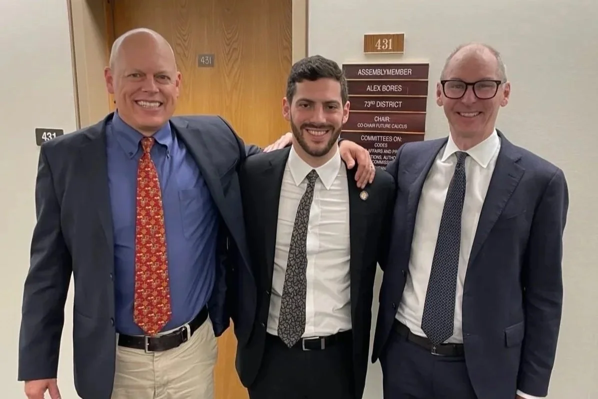 Transparency Coalition CEO Rob Eleveld (left) and Senior Technical and Policy Advisor Adam Cappio (right) meet with New York State Assemblymember Alex Bores, co-author of the Responsible Artificial Intelligence Safety and Education (RAISE) Act.