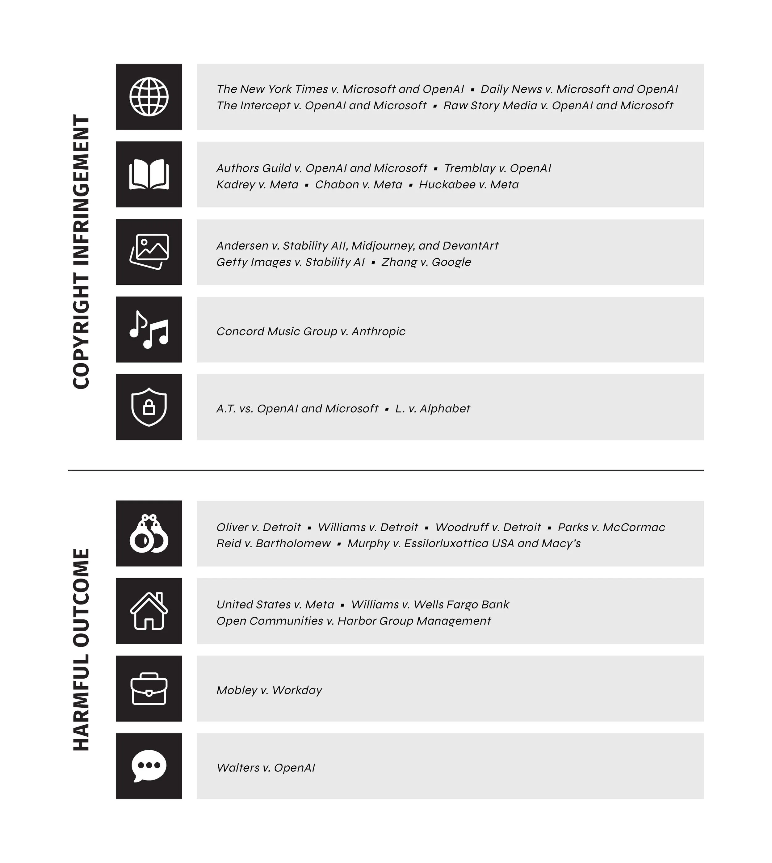 The hailstorm of AI-related lawsuits over the past nine months can make the litigation space feel chaotic and confusing. In fact, the lawsuits can be roughly sorted into two buckets: copyright infringement and harmful AI-driven outcomes.