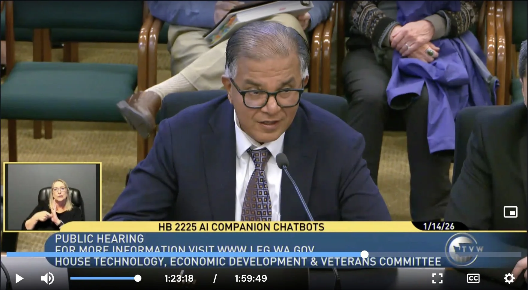 TCAI Co-founder and COO Jai Jaisimha, above, offered expert testimony at a hearing for the chatbot safety bill in Olympia in January.