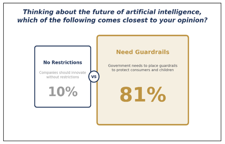 Only 10% of bipartisan respondents indicated they were in favor of no restrictions on companies developing AI, while 81% said government should place appropriate guardrails around AI to protect consumers and kids.