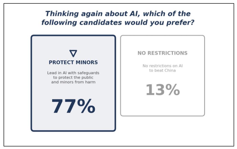 In a result that may have real consequences in this national election year, 77% of respondents said they would prefer a candidate who advocates to protect consumers and kids from the harms of AI, as opposed to a candidate who wants no protections on AI “to beat China.”