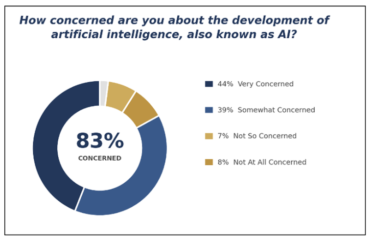 An overwhelming portion of respondents, 83%, said they are concerned about the development of artificial intelligence. A nearly identical (81%) percentage of voters across party lines said the government needs to create guardrails to protect consumers and children from the harms of AI.
