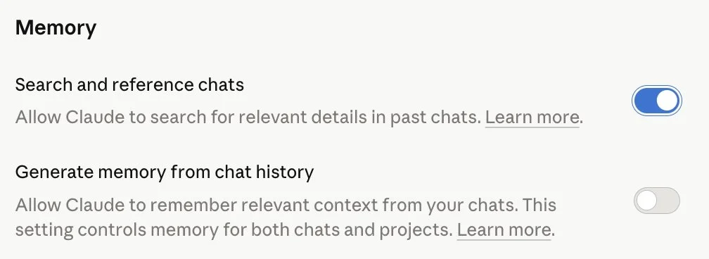 Turn both of these Memory toggles to off. (Blue is on: Allow Claude to remember and search your chats. Gray is off.)